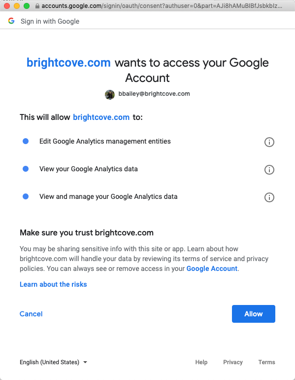 - Brightcove が Google アカウントにアクセスできるように 許可 をクリックします。